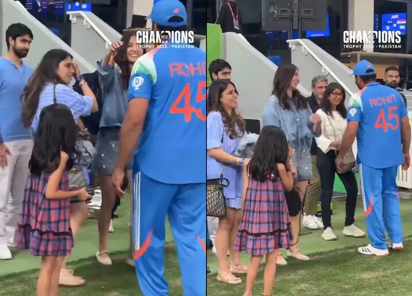 Near the team's dugout, Rohit Sharma's wife Ritika Sajdeh and their daughter Samaira eagerly awaited the Indian captain as the festivities took place at the Dubai International Cricket Stadium.